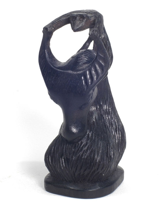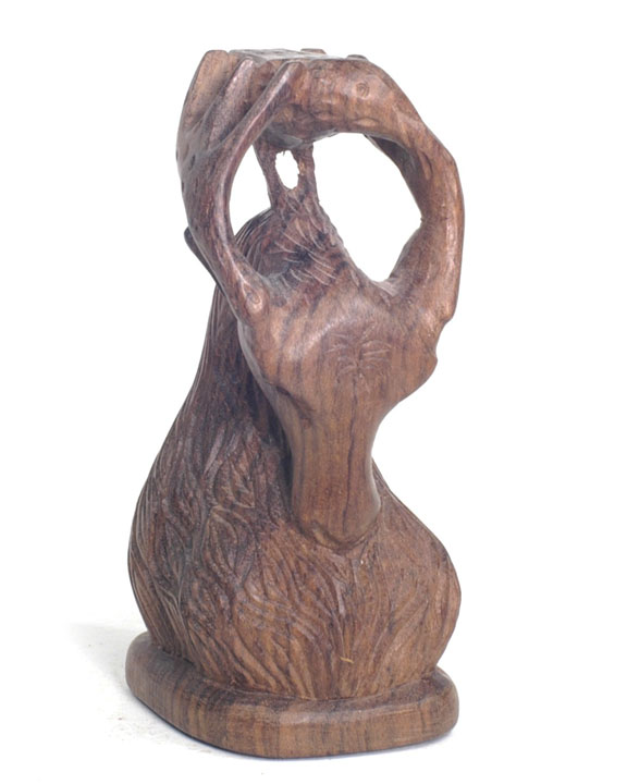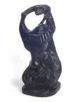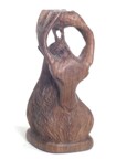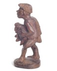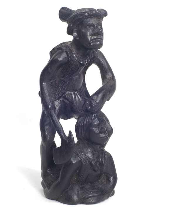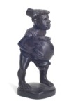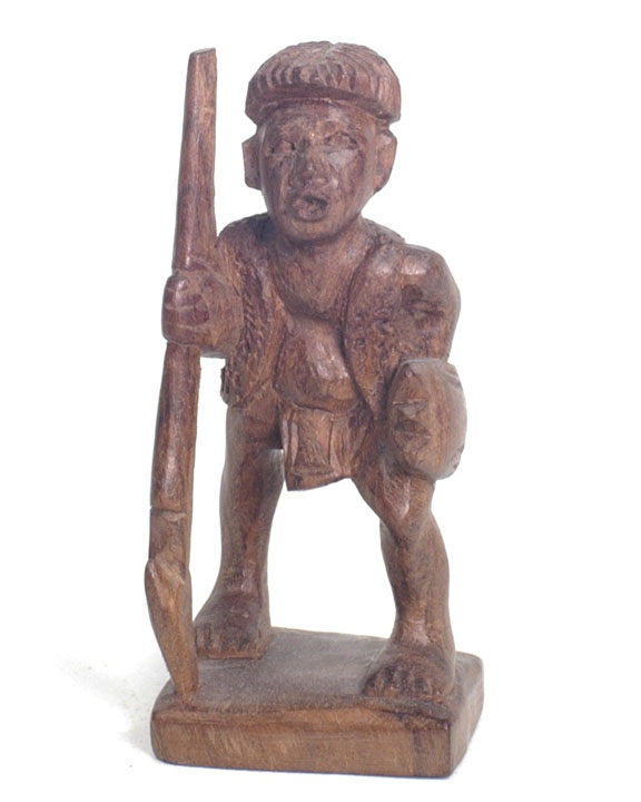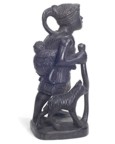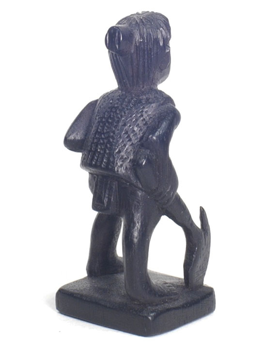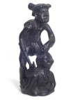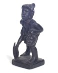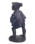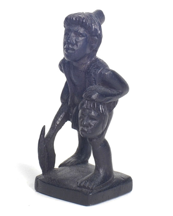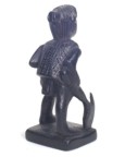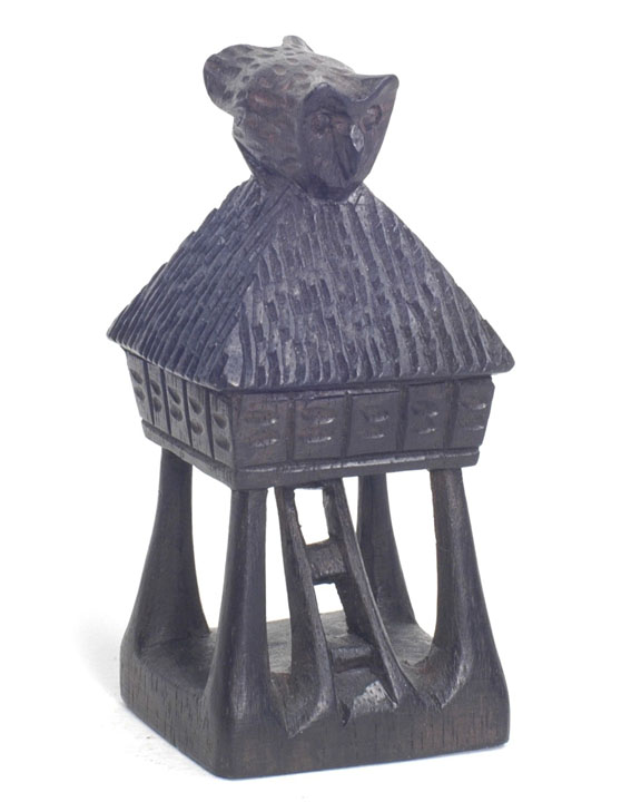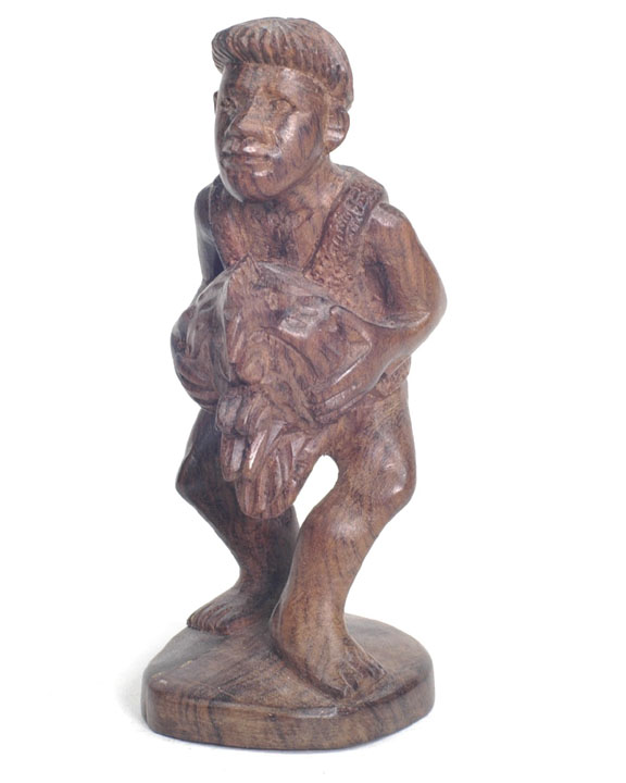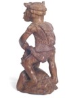 | The Bontoc king is holding a head about to be sliced off, as are all the pawns. The rook shows a typical native hut, but in this case, the ladder goes up the inside and through the floor as was characteristic of this tribe. It also has an owl on top which is more common in the Bontoc region. The bishop is holding a bowl specifically designed for holding rice wine for the celebration after the head hunting. Heads must be obtained as proof of the killing, and a three day celebration follows with dancing about the heads that are hung up. The knight is a carabao (a wild water buffalo), and the queen has a baby on her back. |