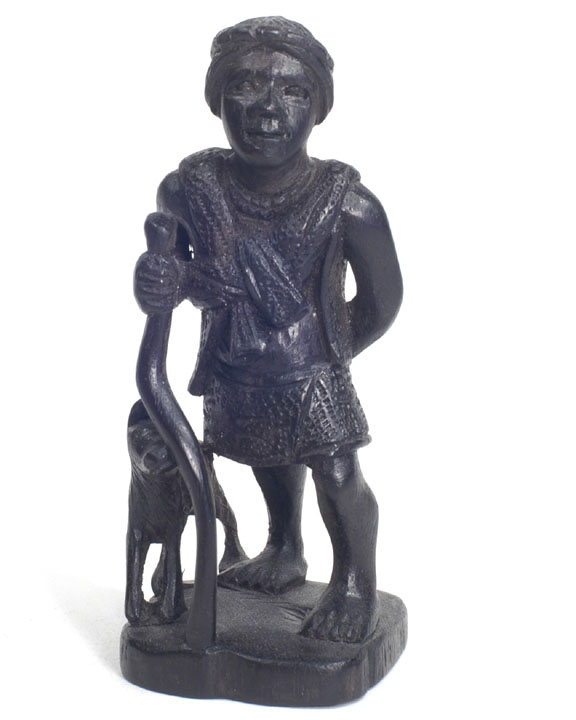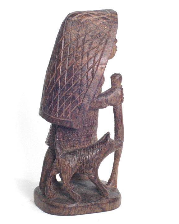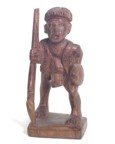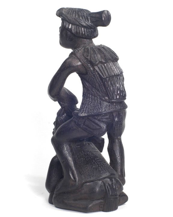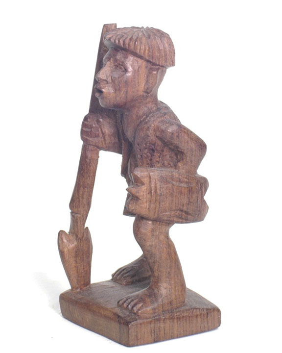 | The name "Ifugao" comes from a bird common to the region. The rook is a native hut with the ladder going up the side and a chicken on top. The knight is the local deer. The pawns are holding chickens. Each bishop is holding a chicken because they sacrifice the chicken before going to war, and the bile helps them determine whether or not to go to war. The king has a head about to be sliced off. The queen has a tarp on her back used for harvesting sweet potato (kamote); she is using it as a headdress against rain. |
