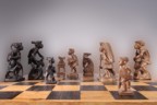 and the Ifugao. Both the white and black are carved from kamagong. The heartwood is naturally solid black, and has been selected to avoid any lighter streaks. The sapwood is lighter in color and shows the grain well. The chess board is made from kamagong and nara wood. The board also serves as a box for storage of the pieces. The Ifugao are represented in white: |