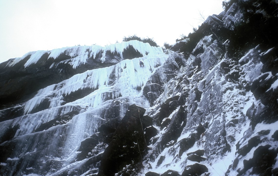 Ade climbs the sketchy ice in the center section of Power Play