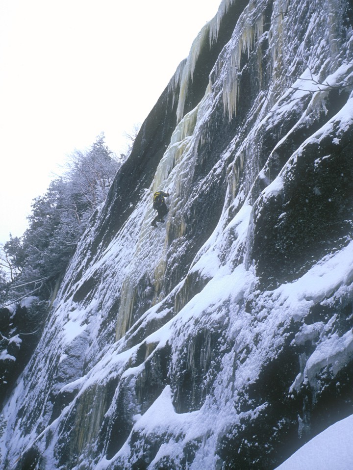 Bones climbs thin, poorly protected ice leading to a free-hanging ice column above