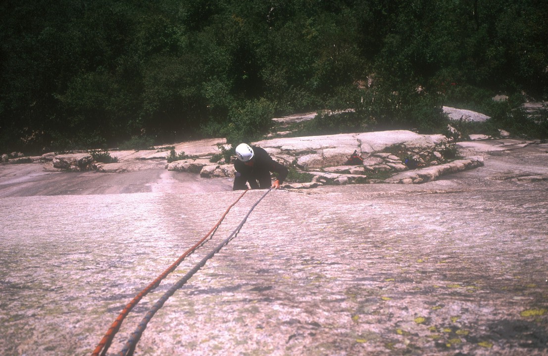 Bones at the crux of the first pitch; from here, the route continues [climber's] left on an unprotected 5.8 face