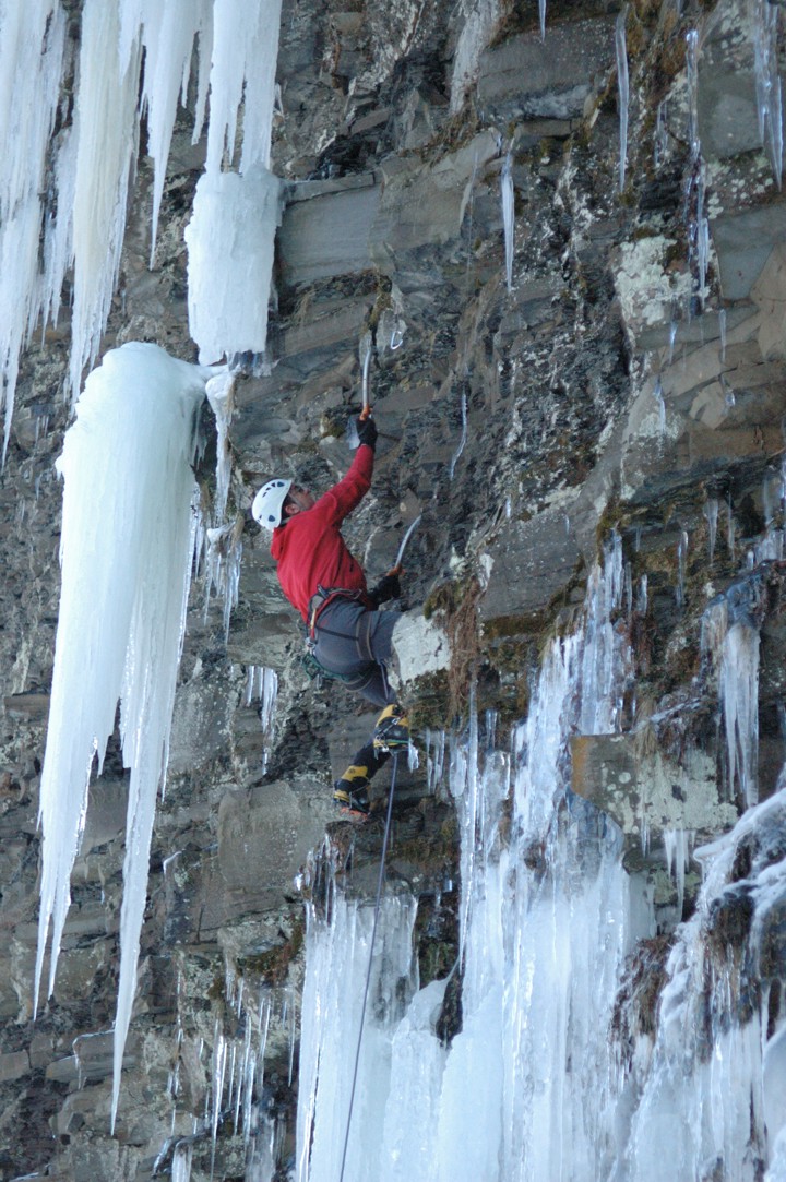 Dry-tooling up to the right side of a small ledge