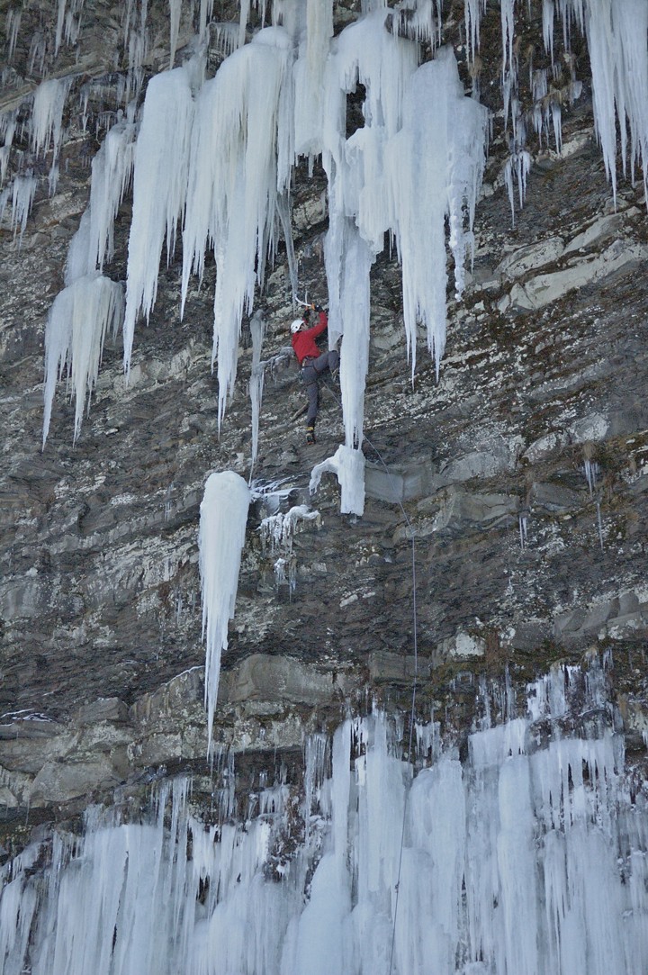 From the top of the small ledge, Bones steps left, then climbs rock and a thin ice column straight up