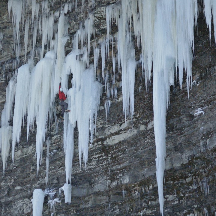 From the top of the ice column, Bones mounts the ice and climbs into a small ice cave to rest