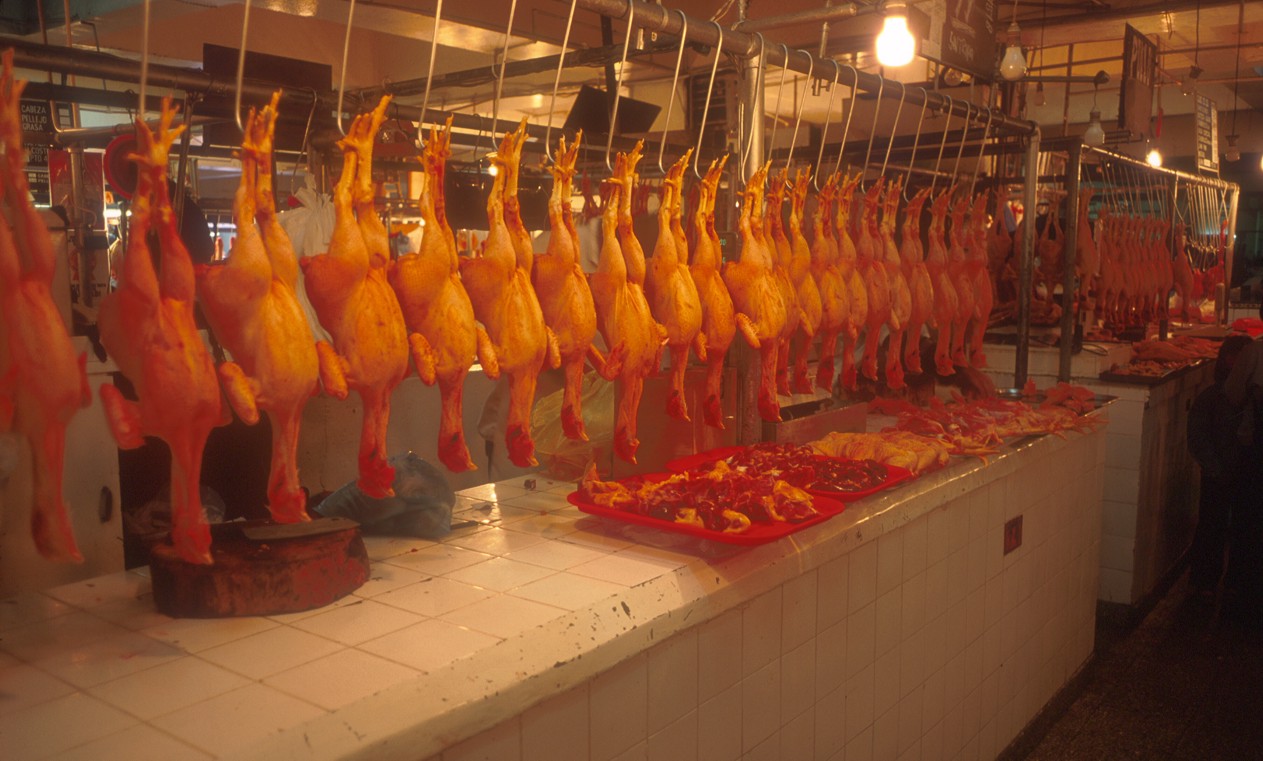 Chickens and chicken bits at the market in Lima