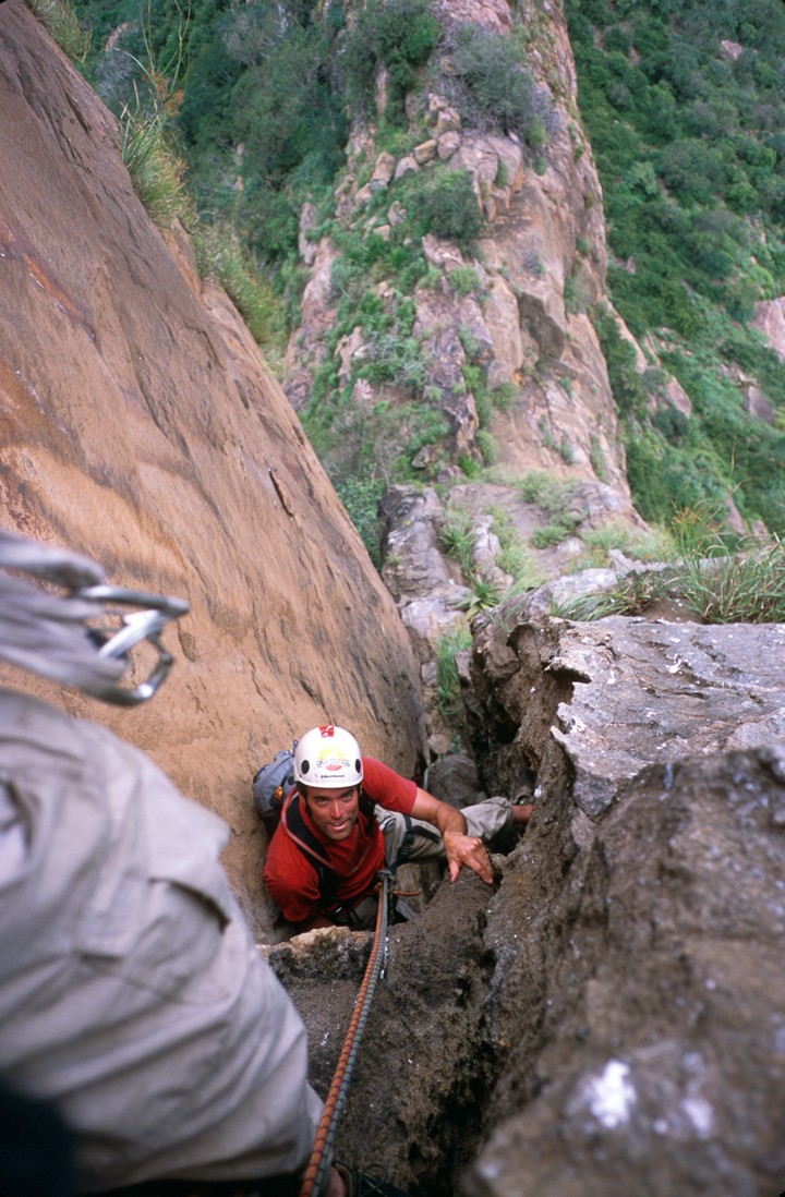 Chris arrives at the top of the chimney. This feature was unprotected for more than 100', and about 5.7 in difficulty.