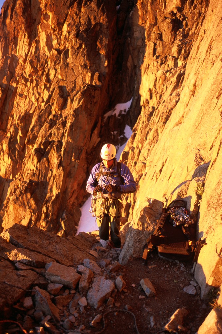 We soloed several pitches up to some ledges, then racked up here at daybreak