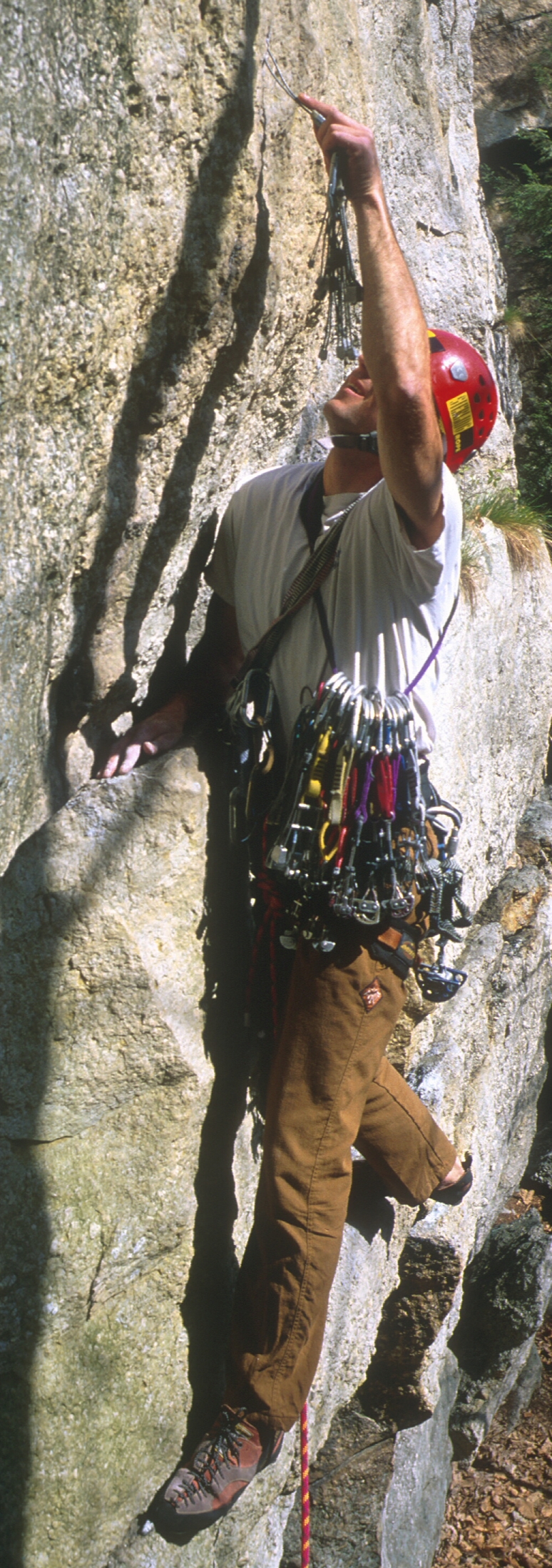 Close-up of Will gearing up for the crux moves on Wegetables