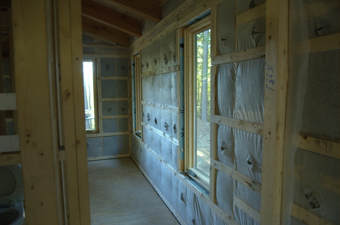 The completed insulation job in the bathroom. Cellulose was blown into the various cavities in the exterior wall.