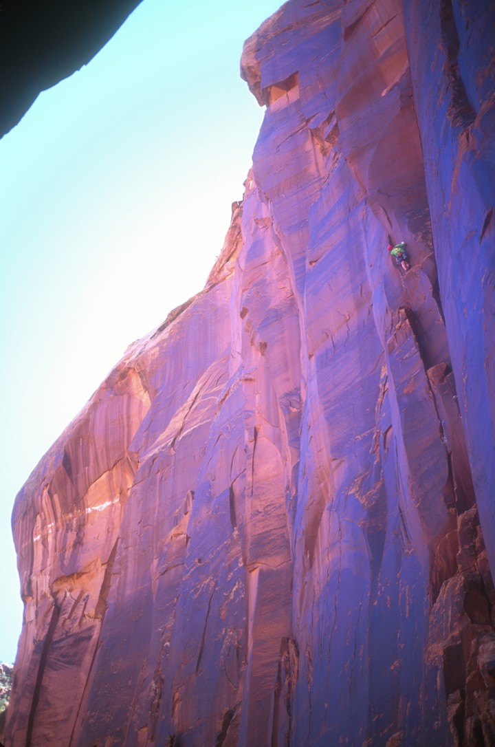 Dave peeks around the corner before heading out onto the left-slanting crack on Lady Pillar