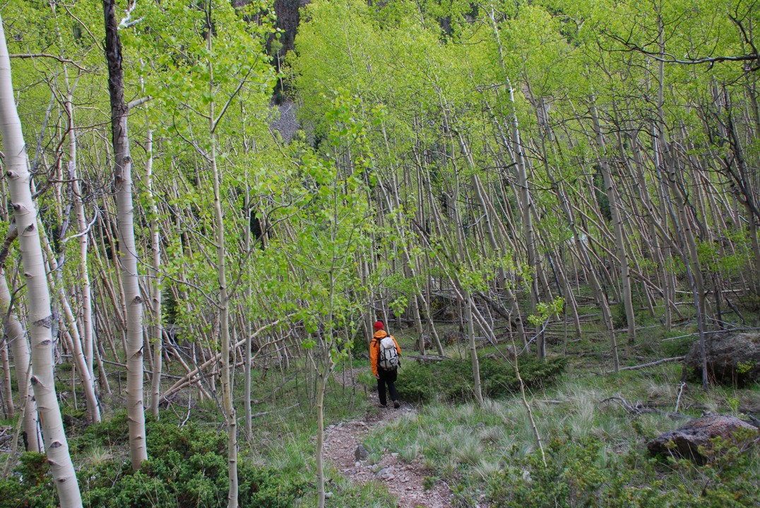 Descending in the rain through a grove of aspens; we picked up a hundred ticks here