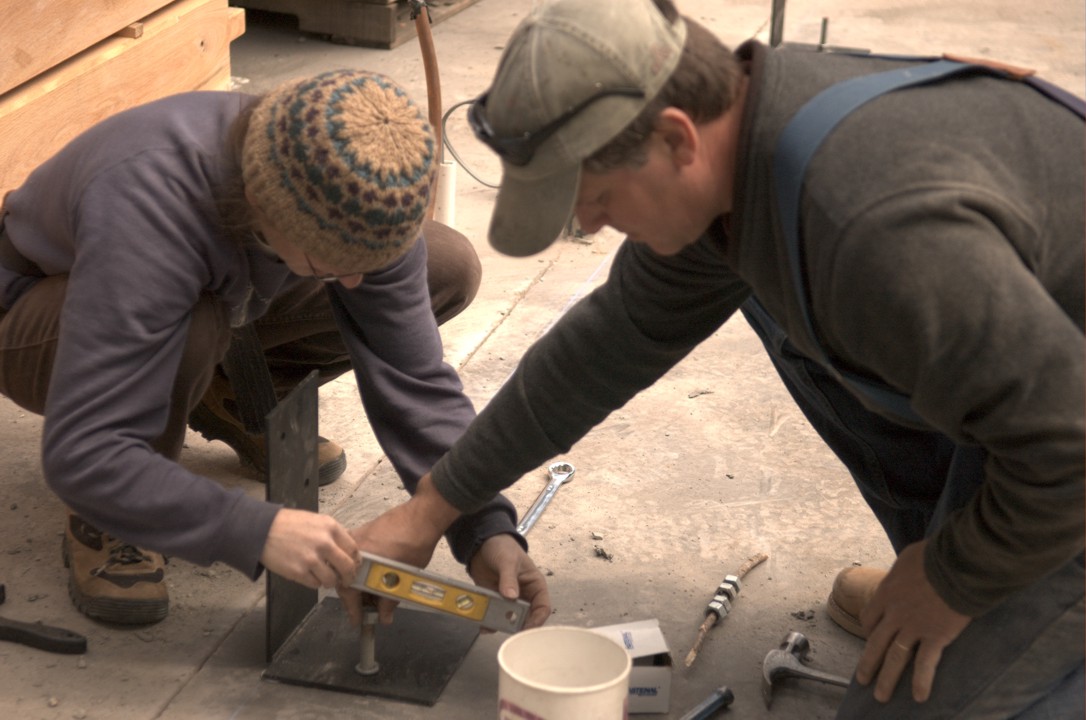 Doug and Nancy locate the metal brackets on which the posts rest