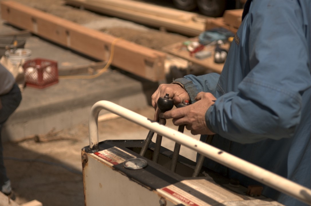 Practiced hands perform the delicate work of moving timbers into place