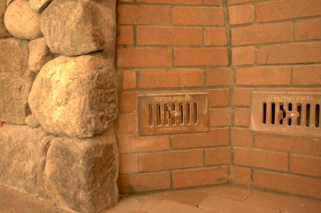 Metal air intake vents in the fireplace box