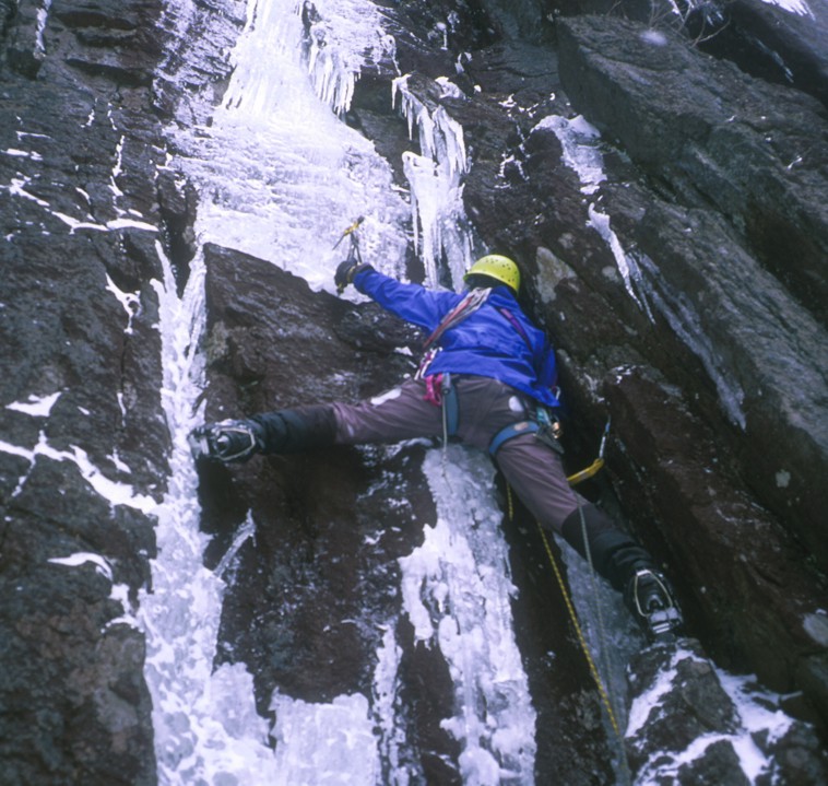 Joe on Gate Keeper, just left of the 2nd hitch-up-matilda; we bailed here due to delaminated ice