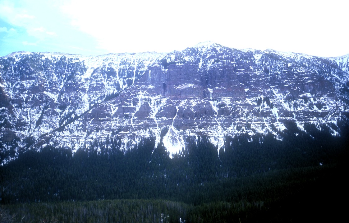 The main fork of Hyalite Canyon; Winter Dance is the spear of ice on the rock face centered in the photo