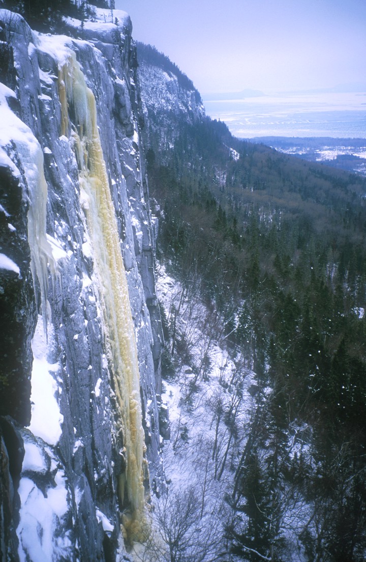 The climb Icebreaker as seen from the top of Whimpsickle; the body of water in the background is Kama Bay on Lake Superior