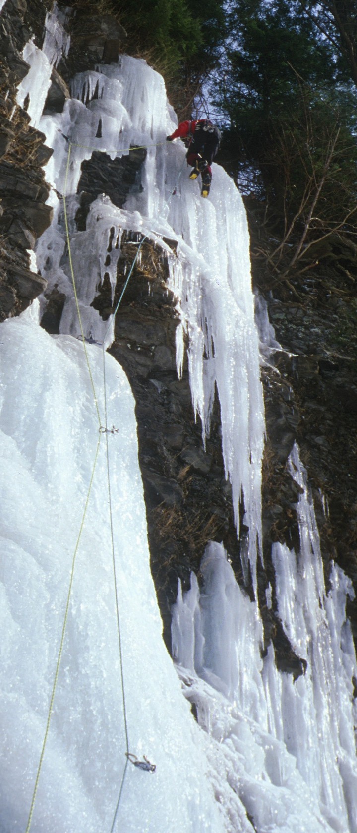 Jim climbs poorly bonded ice on the first ascent