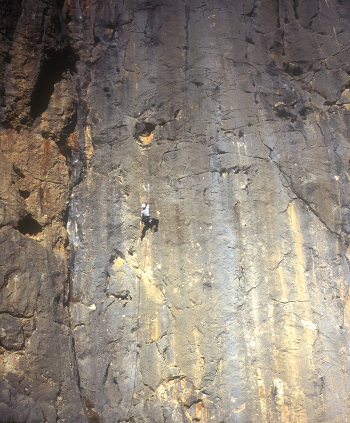 Jen climbs a difficult face with "flaky jugs"