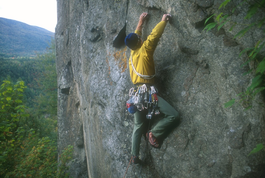 Jeremy places a piece of gear into the expanding flake above the bolt; this gear sucks, and he later removed it