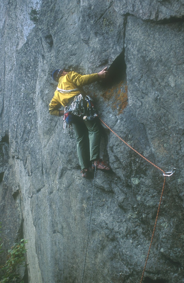 After reaching a good hold for the left foot, Jeremy scopes the shallow corner for better protection