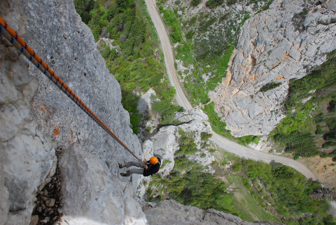Rappelling through the "eye" of the needle at the top of Batteries Not Included