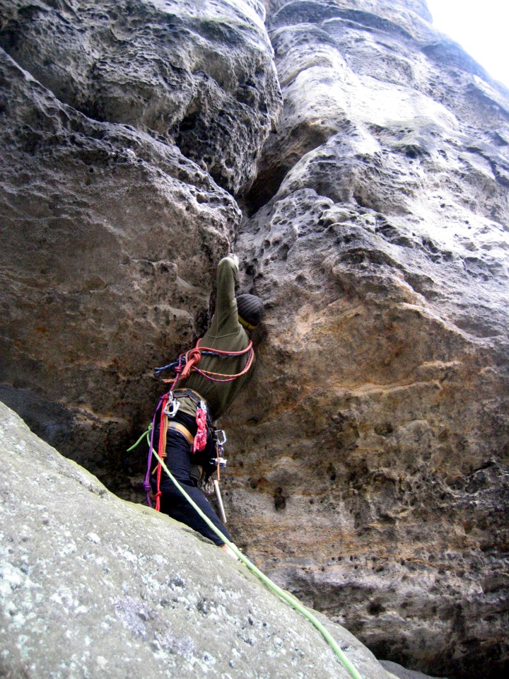 Making the crux moves at the start of the route -- an overhanging offwidth crack protected by jammed knots, the first knots I placed in Elbsandstein