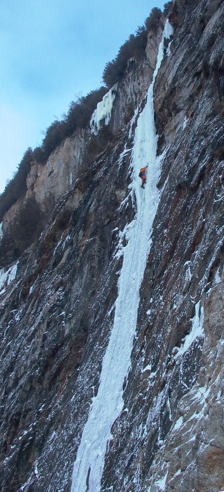 The crux of the route climbs is the steeper section of ice just below the cave belay