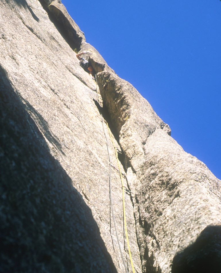 Disappearing into the off-width; this is actually climbed on the outside, but it's hard to make the transition