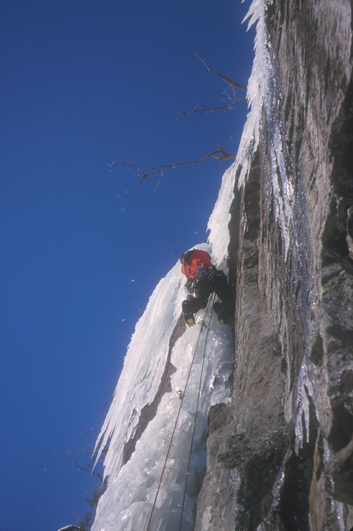 Leading the top crux column of Midlife Crisis in cold, brittle conditions