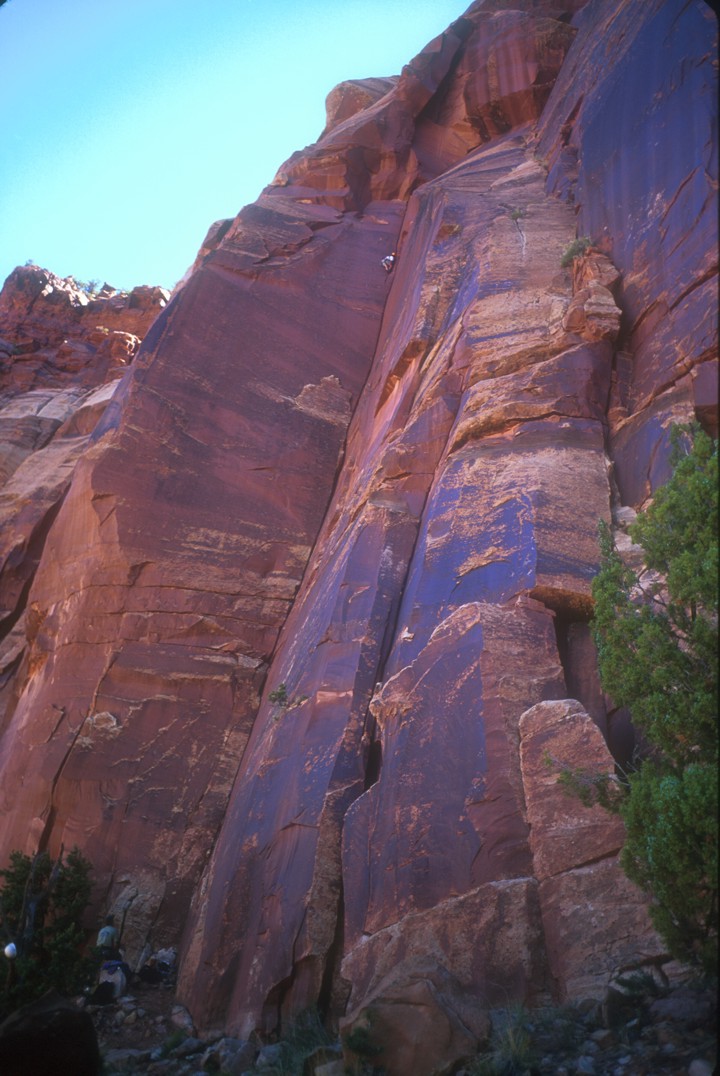 Jamming the final crack high in the Sabbatical corner, belayed by Brian