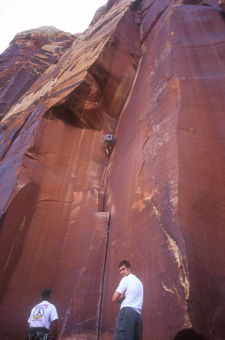 Jim climbs The Incredible Hand Crack, belayed by Brian; most people find this climb a pleasure, but my large large hands didn't fit the crack and made the crux overhanging section very strenuous