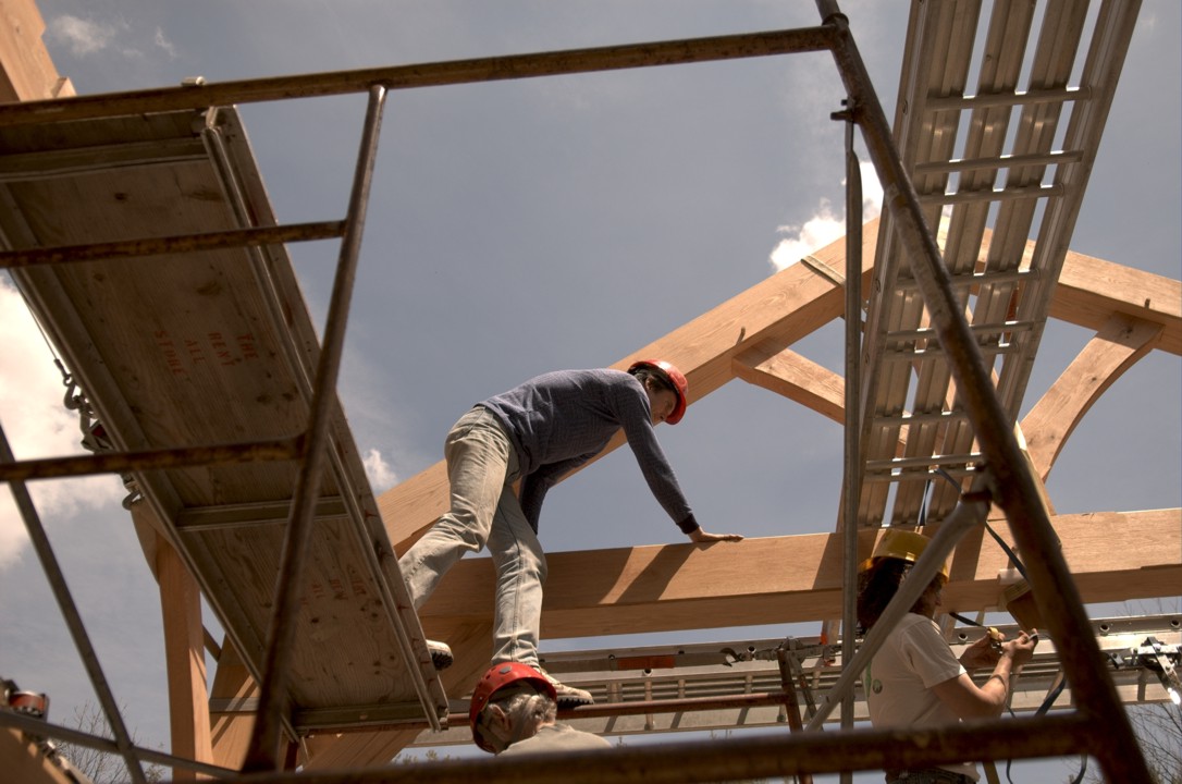 Moving about the timber frame is easy for climbers