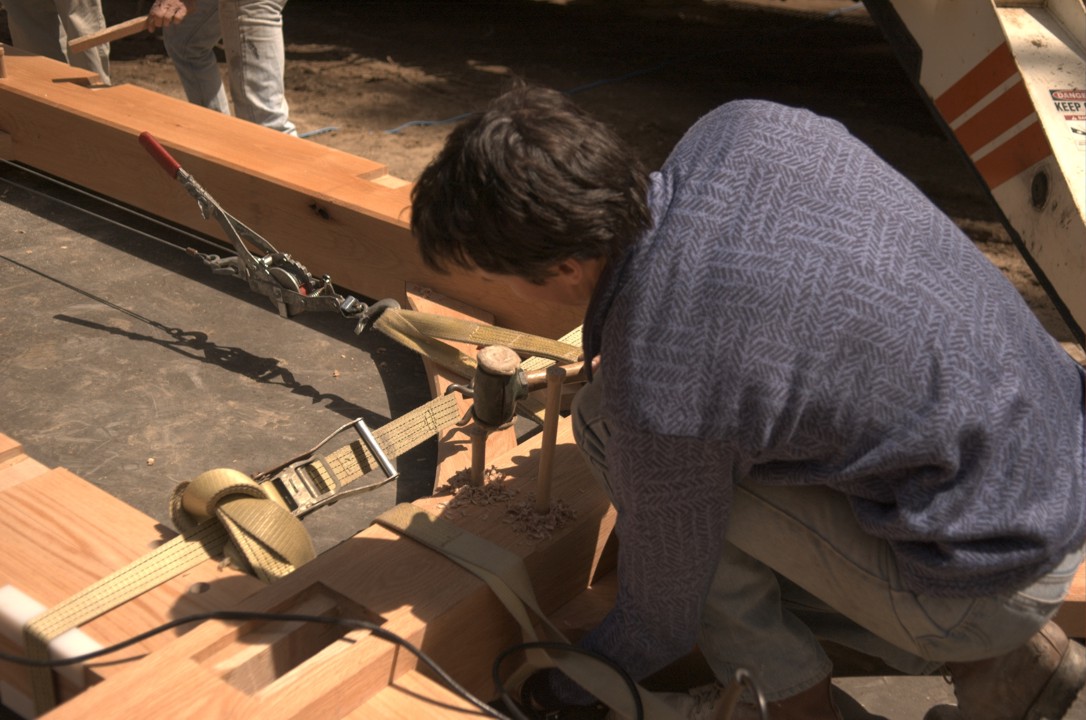 Pounding a dowel into place to hold a joint together
