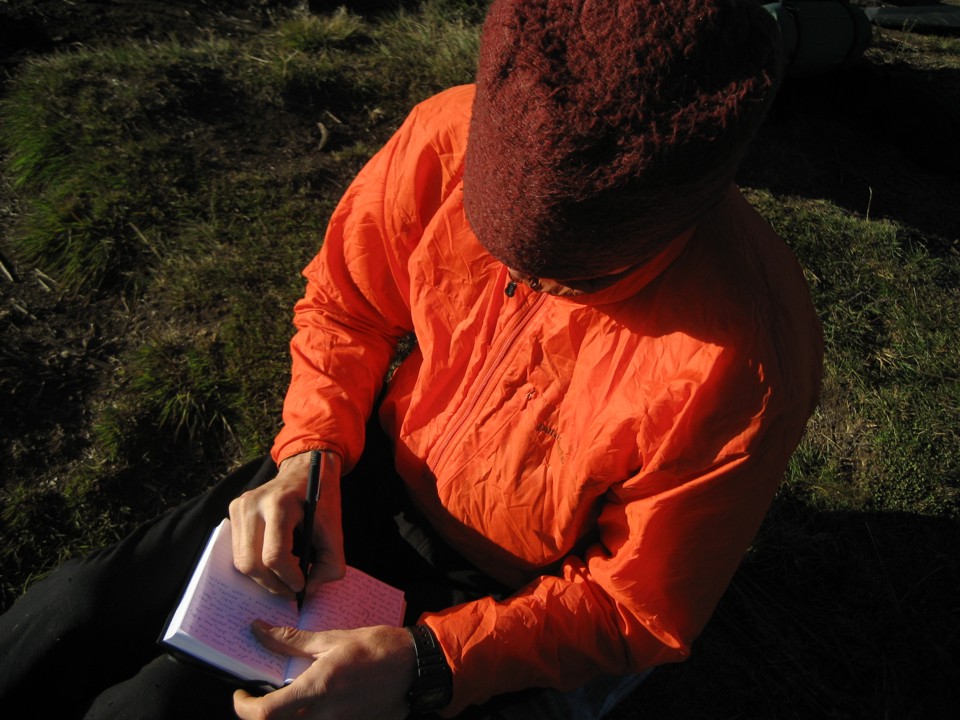 Writing in the journal at camp at the start of the approach