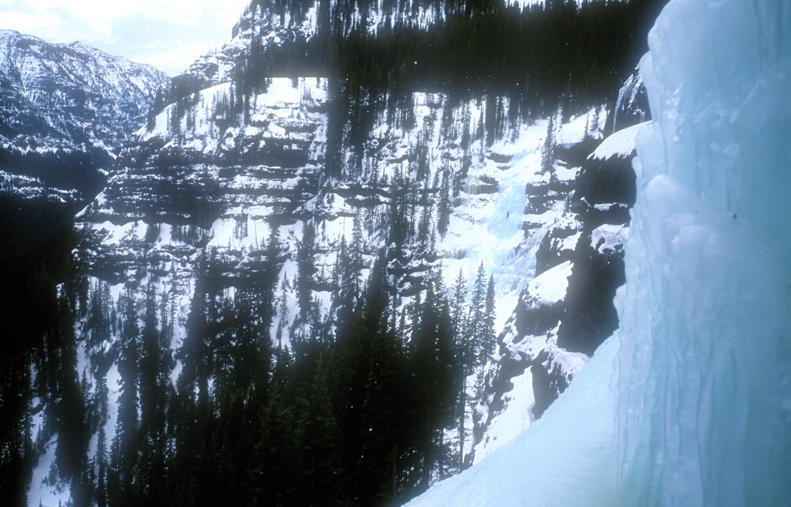 View from the second pitch of Cleopatra's Needle; you can see Joe on Twin Falls Left, belayed by Ellen in the trees below