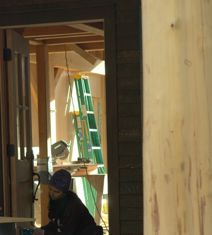 Lucie sands the front door; for some reason, the door was delivered with black mold on the lower half