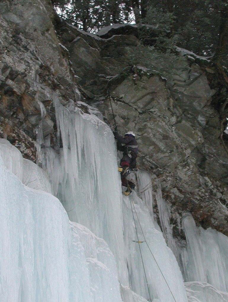 Series 7: Clipping the fixed runner at the top of the ice; the runner is connected to a bolt, the first placed at Salmon River