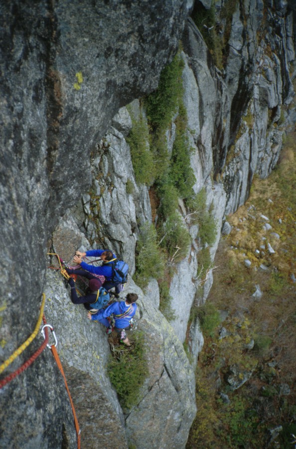 Looking down from the roof pitch of Mental Blocks at Stuart, Roger, and Jim