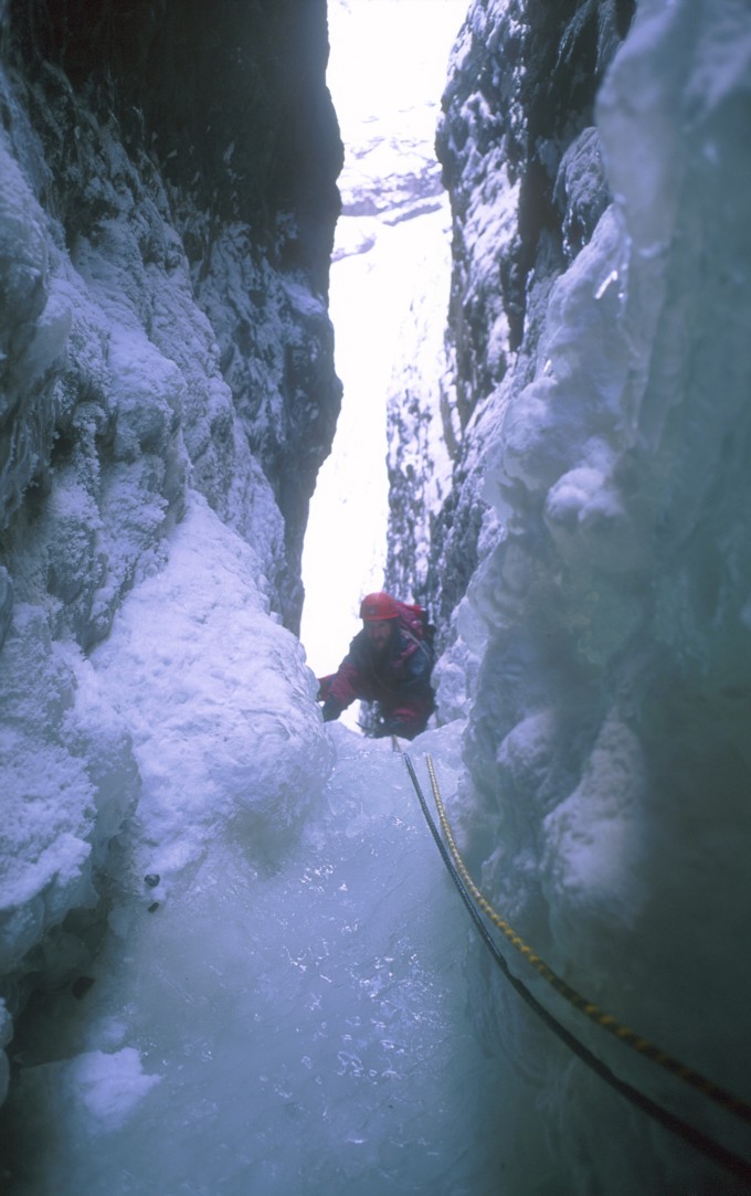 Nikos following the second pitch up to the protected cave in the midsection of the chimney