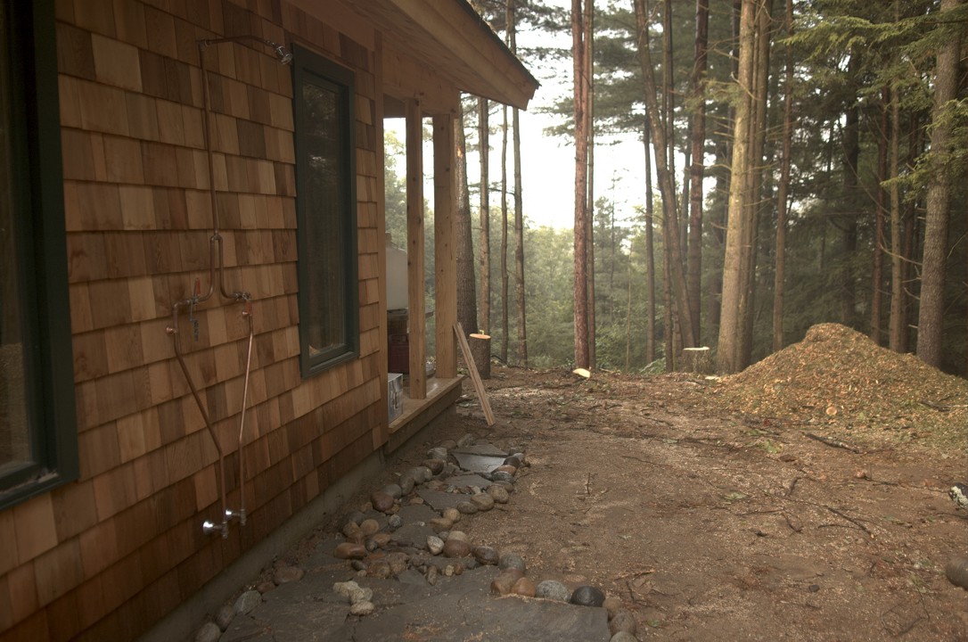 An outdoor shower is installed on the west side of the Hut, providing us early access to water