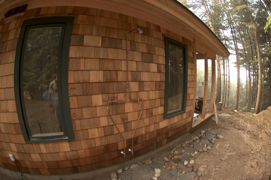 The outdoor shower is made of rough copper piping, well suited to the look-and-feel of the Hut