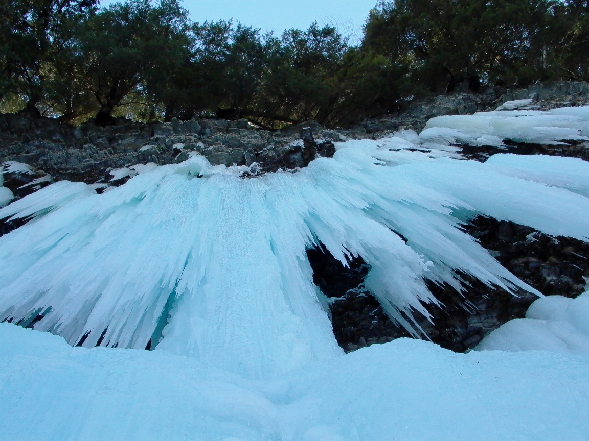 Shot of the route taken from the base showing the steep, overhanging ice and the rock roofs above