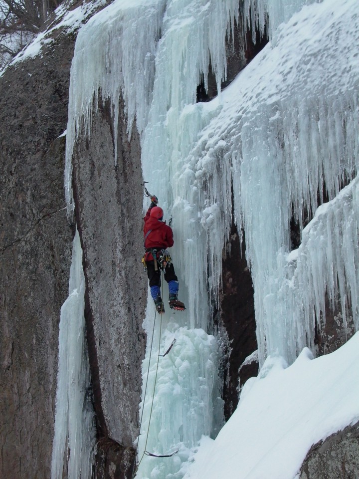 Tommy climbs the WI5 pillar on the left side of Polar Soldier