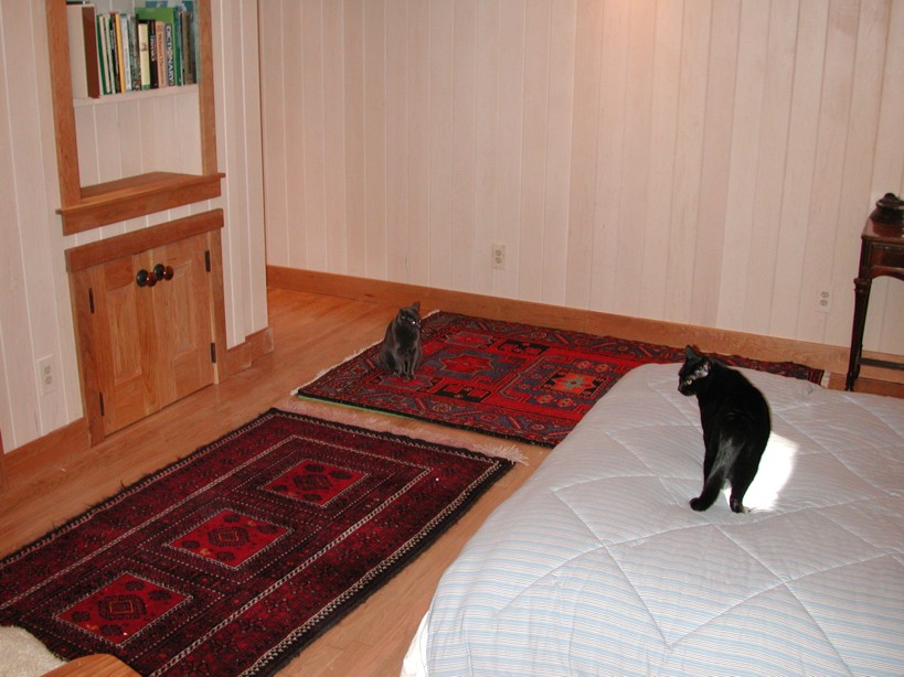 Posey and George on the bed in the basement bedroom
