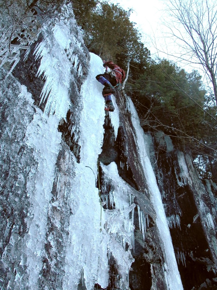 The cave is exited using an ice host that drips on the face to the left; the strip of ice on the right is Laceration