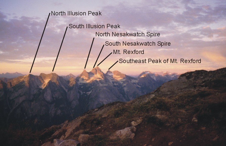 Rexford mountain range with labels, taken from the bivy on the Northeast Buttress of Mt. Slesse