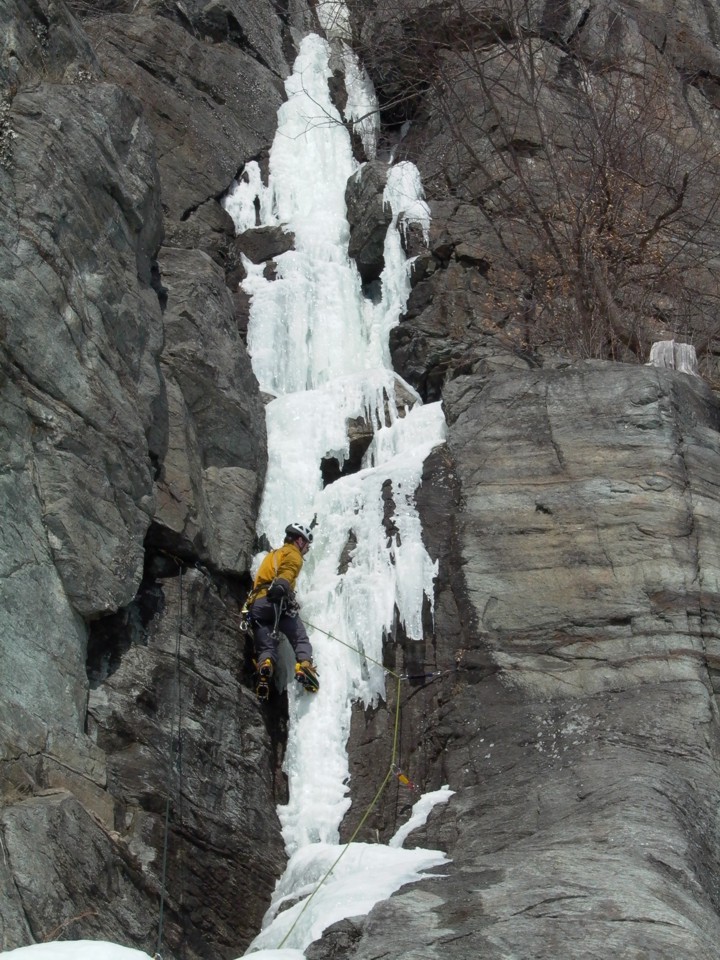 With the gear in place, the ice column can be safely climbed