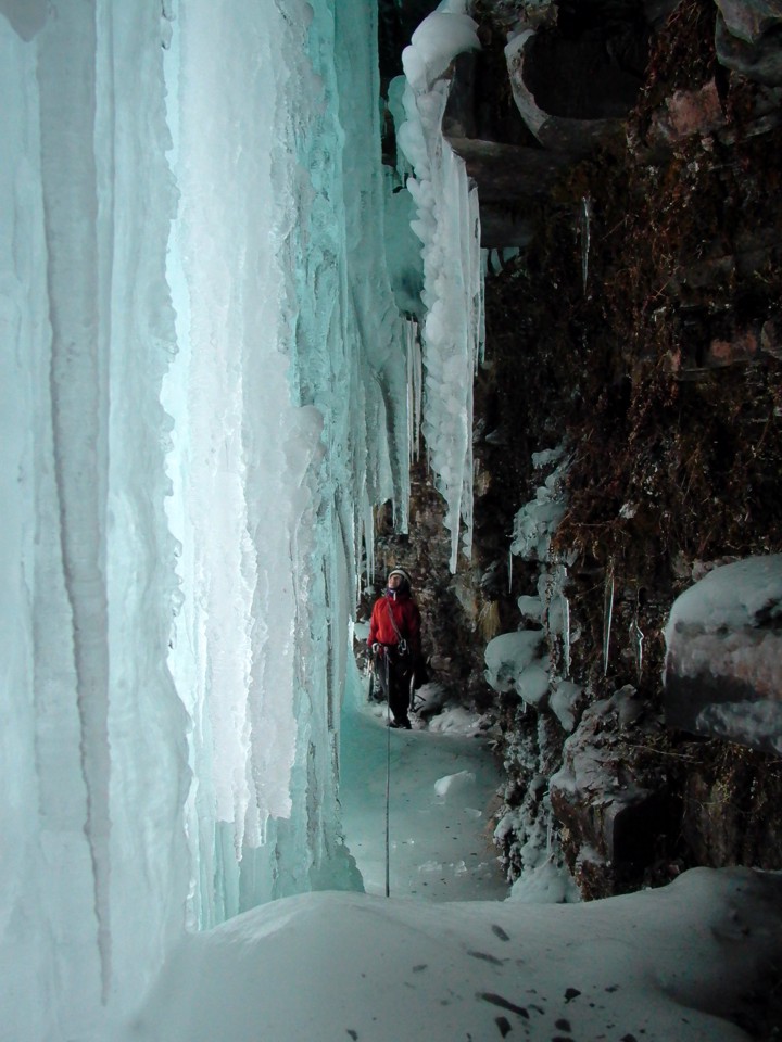 One of the more creative routes at the Gorge, Curtain Call traverses behind all the pillars on the Amphitheatre wall, finally emerging from a hole and finishing up on Salmon Runs